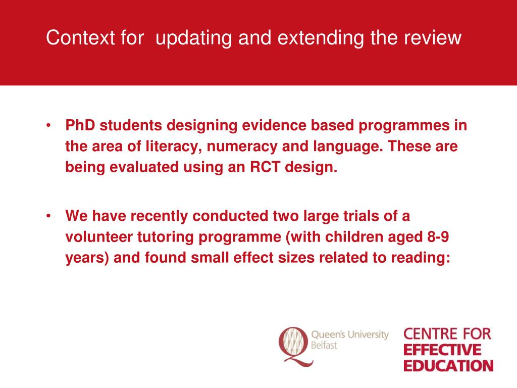 Context for updating and extending the review • PhD students designing evidence based programmes in the area of literacy, numeracy and language. These are being evaluated using an RCT design. • We have recently conducted two large trials of a volunteer tutoring programme (with children aged 8-9 years) and found small effect sizes related to reading: