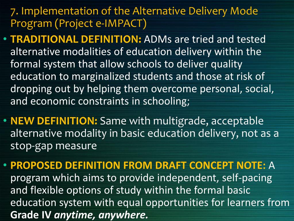 7. Implementation of the Alternative Delivery Mode Program (Project e-IMPACT) TRADITIONAL DEFINITION: ADMs are tried and tested alternative modalities of education delivery within the formal system that allow schools to deliver quality education to marginalized students and those at risk of dropping out by helping them overcome personal, social, and economic constraints in schooling; NEW DEFINITION: Same with multigrade, acceptable alternative modality in basic education delivery, not as a stop-gap measure PROPOSED DEFINITION FROM DRAFT CONCEPT NOTE: A program which aims to provide independent, self-pacing and flexible options of study within the formal basic education system with equal opportunities for learners from Grade IV anytime, anywhere.