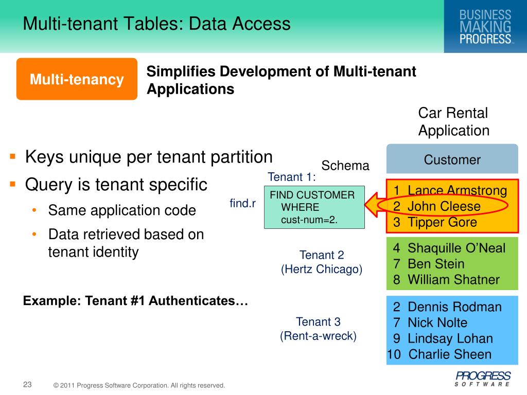 Multi-tenant Tables: Tenant Provisioning • Tenant creation: ABL, APIs, DDL & GUI • Programmatic tenant provisioning • Tenant partition creation is optional • Tenant-level activation/deactivation • Identification (via “_Tenant” table) • Database specific tenant ID • User friendly name: “Hertz Boston” • App specific ID (could be UUID) Car Rental Application Customer Schema 1 Lance Armstrong 2 John Cleese 3 Tipper Gore Tenant 1 (Hertz Boston) Tenant 2 (Hertz Chicago) 4 Shaquille O’Neal 7 Ben Stein 8 William Shatner 2 Dennis Rodman 7 Nick Nolte 9 Lindsay Lohan 10 Charlie Sheen Tenant 3 (Rent-a-wreck)