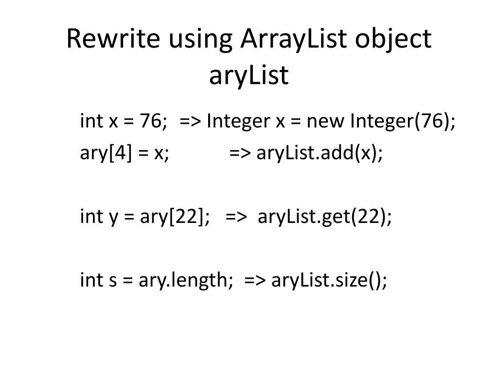 Rewrite using ArrayList object aryList int x = 76; => Integer x = new Integer(76); ary[4] = x; => aryList.add(x); int y = ary[22]; => aryList.get(22); int s = ary.length; => aryList.size();