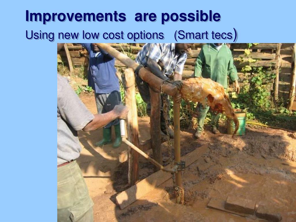 Rope pumps and Tippy taps WASH options for $3 / child Smart tecs that make children proud. WHO study Improved watsan $ 5 - 28 benefit / $1 invested . Problems in rural water supply Unsafe water from open wells. 3 0 - 40 % of piston pumps do not work. Why don’t people fix them*.