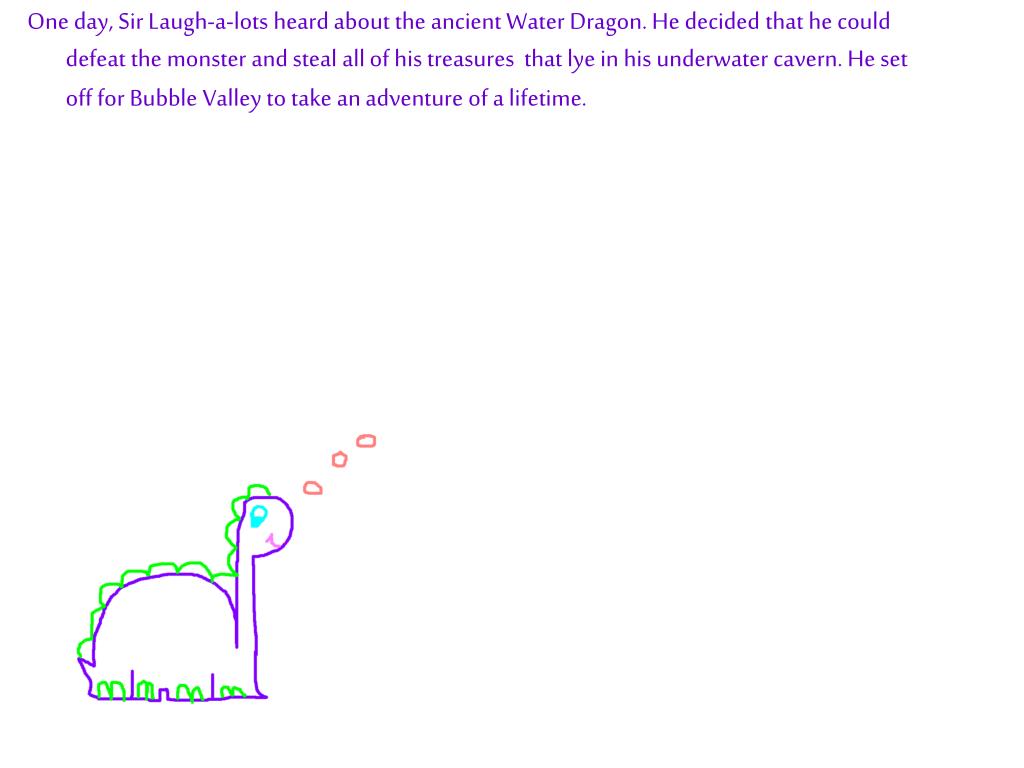 One day, Sir Laugh-a-lots heard about the ancient Water Dragon. He decided that he could defeat the monster and steal all of his treasures that lye in his underwater cavern. He set off for Bubble Valley to take an adventure of a lifetime.