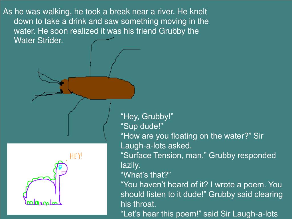 As he was walking, he took a break near a river. He knelt down to take a drink and saw something moving in the water. He soon realized it was his friend Grubby the Water Strider. “Hey, Grubby!”“Sup dude!”“How are you floating on the water?” Sir Laugh-a-lots asked.“Surface Tension, man.” Grubby responded lazily.“What’s that?”“You haven’t heard of it? I wrote a poem. You should listen to it dude!” Grubby said clearing his throat.“Let’s hear this poem!” said Sir Laugh-a-lots excitedly.