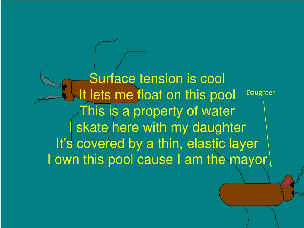Surface tension is coolIt lets me float on this poolThis is a property of waterI skate here with my daughterIt’s covered by a thin, elastic layerI own this pool cause I am the mayor Daughter
