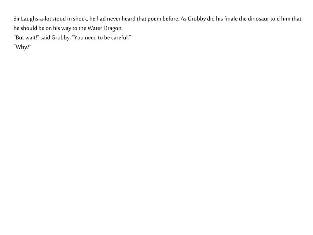 Sir Laughs-a-lot stood in shock, he had never heard that poem before. As Grubby did his finale the dinosaur told him that he should be on his way to the Water Dragon. “But wait!” said Grubby, “You need to be careful.” “Why?”