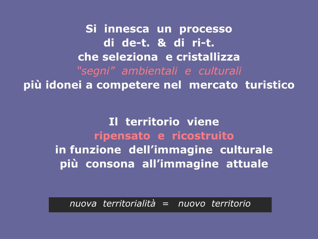 Si innesca un processo di de-t. & di ri-t. che seleziona e cristallizza “segni” ambientali e culturali più idonei a competere nel mercato turistico Il territorio viene ripensato e ricostruito in funzione dell’immagine culturale più consona all’immagine attuale nuova territorialità = nuovo territorio