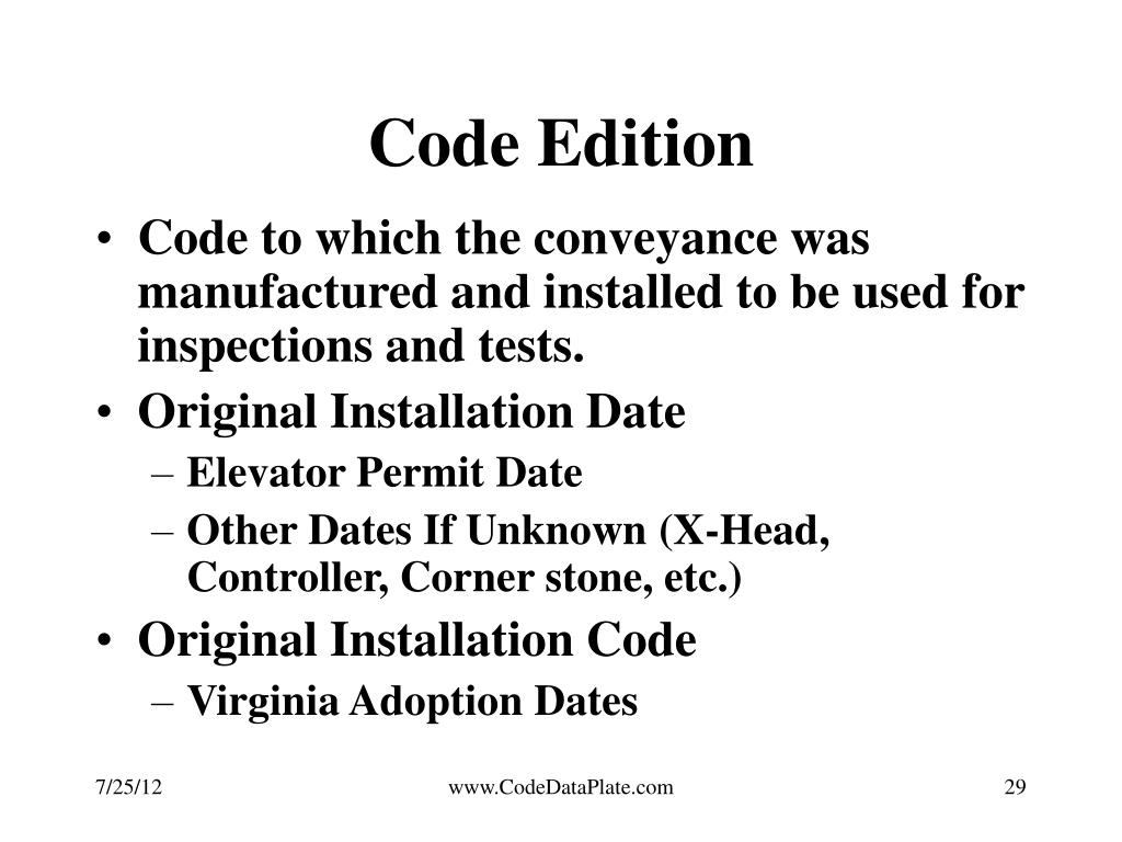 Code Edition • Code to which the conveyance was manufactured and installed to be used for inspections and tests. • Original Installation Date • Elevator Permit Date • Other Dates If Unknown (X-Head, Controller, Corner stone, etc.) • Original Installation Code • Virginia Adoption Dates www.CodeDataPlate.com