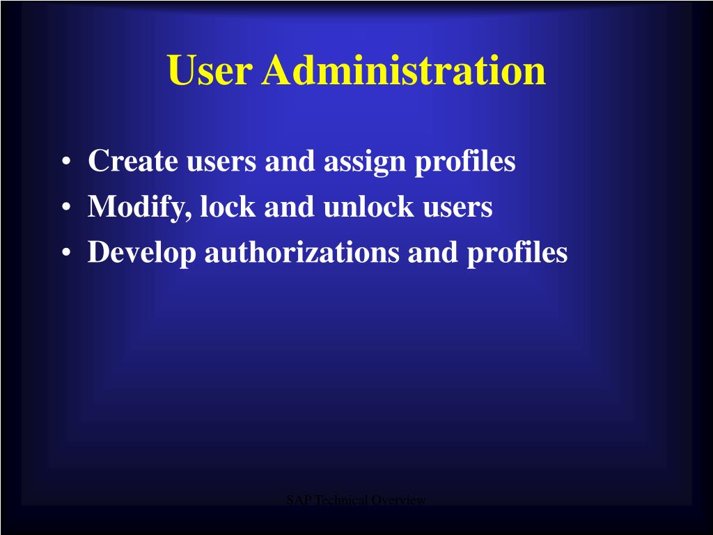 User Administration • Create users and assign profiles • Modify, lock and unlock users • Develop authorizations and profiles SAP Technical Overview