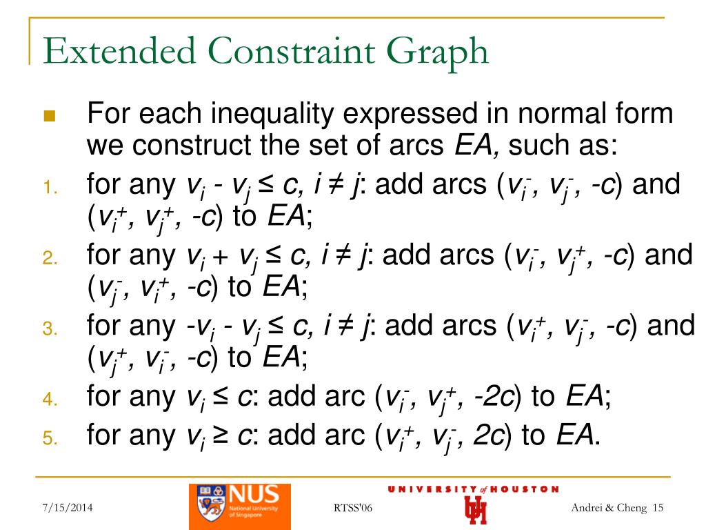 Extended Constraint Graph • For each inequality expressed in normal form we construct the set of arcs EA, such as: • for any vi - vj≤ c, i ≠j: add arcs (vi-, vj-, -c) and (vi+, vj+, -c) to EA; • for any vi+ vj≤ c, i ≠j: add arcs (vi-, vj+, -c) and (vj-, vi+, -c) to EA; • for any -vi - vj≤ c, i ≠j: add arcs (vi+, vj-, -c) and (vj+, vi-, -c) to EA; • for any vi≤ c: add arc (vi-, vj+, -2c) to EA; • for any vi≥ c: add arc (vi+, vj-, 2c) to EA. RTSS'06