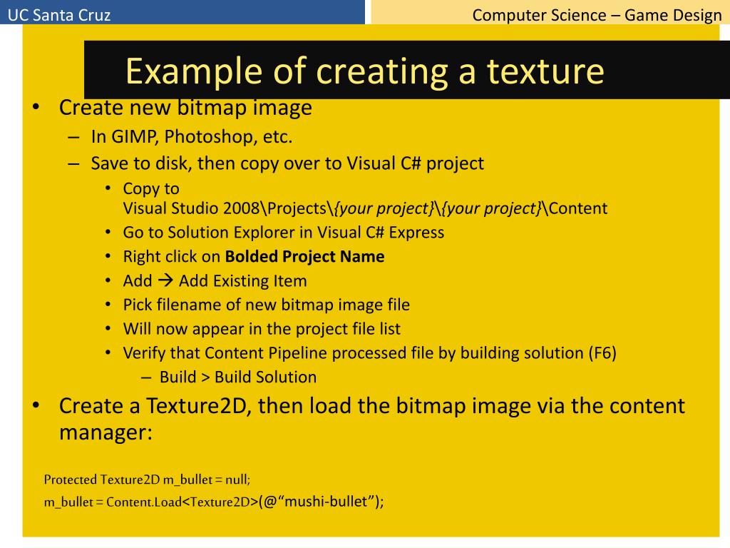 Example of creating a texture • Create new bitmap image • In GIMP, Photoshop, etc. • Save to disk, then copy over to Visual C# project • Copy to Visual Studio 2008\Projects\{your project}\{your project}\Content • Go to Solution Explorer in Visual C# Express • Right click on Bolded Project Name • Add Add Existing Item • Pick filename of new bitmap image file • Will now appear in the project file list • Verify that Content Pipeline processed file by building solution (F6) • Build > Build Solution • Create a Texture2D, then load the bitmap image via the content manager: Protected Texture2D m_bullet = null;m_bullet = Content.Load<Texture2D>(@“mushi-bullet”);