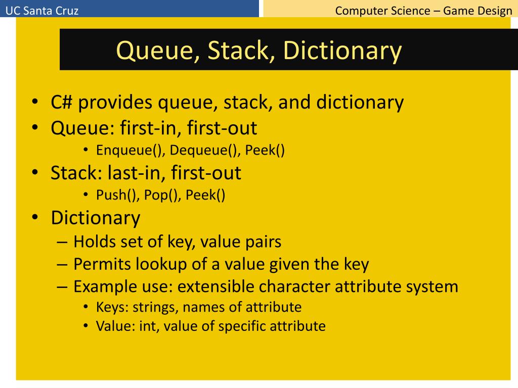 Queue, Stack, Dictionary • C# provides queue, stack, and dictionary • Queue: first-in, first-out • Enqueue(), Dequeue(), Peek() • Stack: last-in, first-out • Push(), Pop(), Peek() • Dictionary • Holds set of key, value pairs • Permits lookup of a value given the key • Example use: extensible character attribute system • Keys: strings, names of attribute • Value: int, value of specific attribute