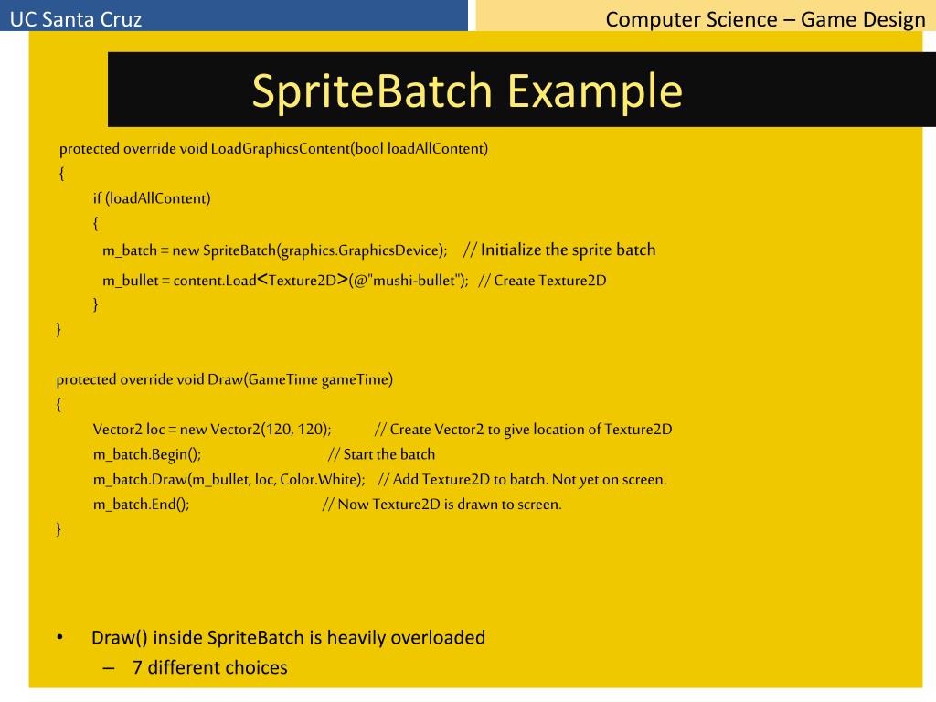 SpriteBatch Example protected override void LoadGraphicsContent(boolloadAllContent) { if (loadAllContent) { m_batch = new SpriteBatch(graphics.GraphicsDevice); // Initialize the sprite batch m_bullet = content.Load<Texture2D>(@"mushi-bullet"); // Create Texture2D } } protected override void Draw(GameTimegameTime) { Vector2 loc = new Vector2(120, 120); // Create Vector2 to give location of Texture2D m_batch.Begin(); // Start the batch m_batch.Draw(m_bullet, loc, Color.White); // Add Texture2D to batch. Not yet on screen. m_batch.End(); // Now Texture2D is drawn to screen. } • Draw() inside SpriteBatch is heavily overloaded • 7 different choices