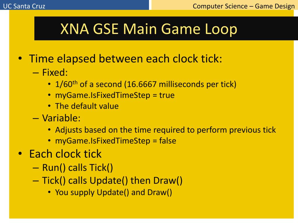 XNA GSE Main Game Loop • Time elapsed between each clock tick: • Fixed: • 1/60th of a second (16.6667 milliseconds per tick) • myGame.IsFixedTimeStep = true • The default value • Variable: • Adjusts based on the time required to perform previous tick • myGame.IsFixedTimeStep = false • Each clock tick • Run() calls Tick() • Tick() calls Update() then Draw() • You supply Update() and Draw()