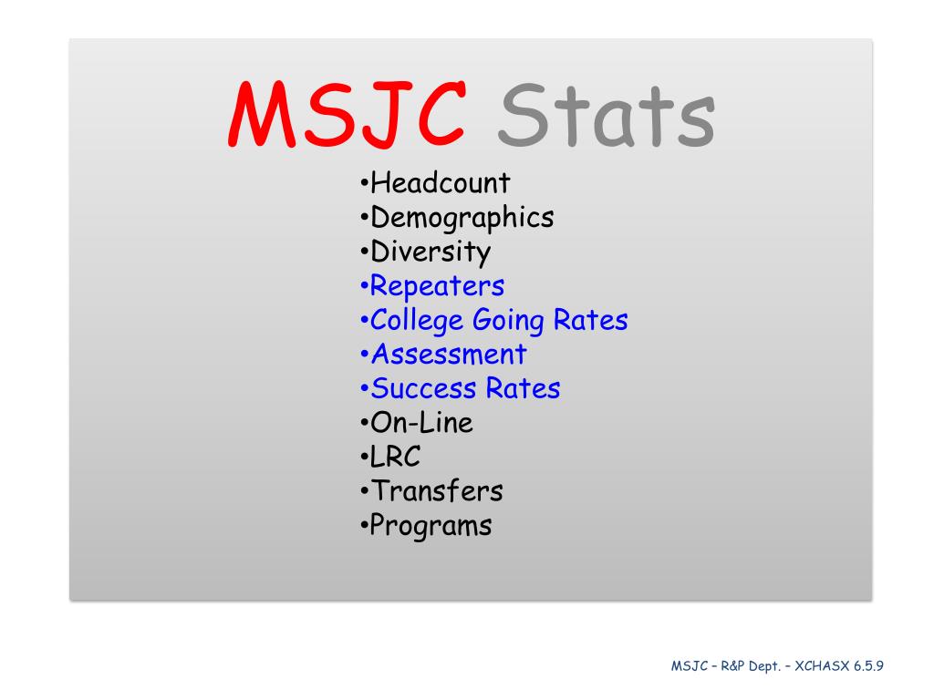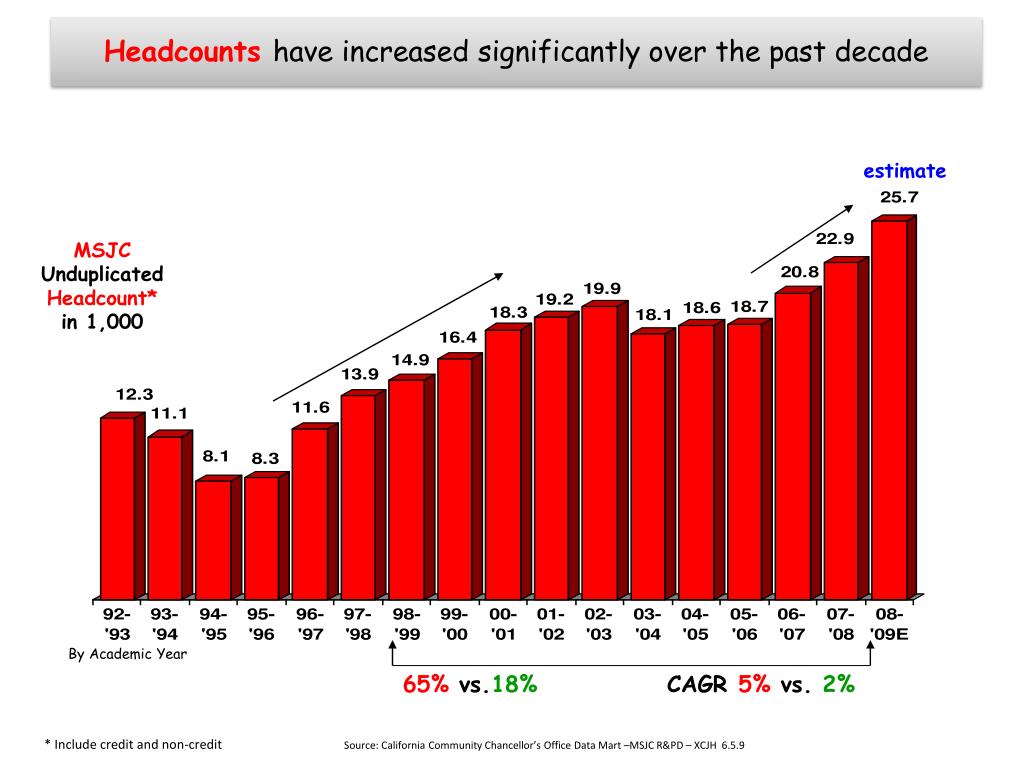 MSJC Stats Headcount Demographics Diversity Repeaters College Going Rates Assessment Success Rates On-Line LRC Transfers Programs. MSJC – R&P Dept. – XCHASX 6.5.9. Headcounts have increased significantly over the past decade. estimate. MSJC Unduplicated Headcount* in 1,000.