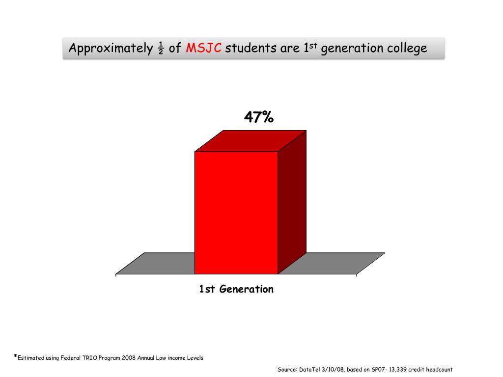 Approximately ½ of MSJC students are 1st generation college • *Estimated using Federal TRIO Program 2008 Annual Low income Levels Source: DataTel 3/10/08, based on SP07- 13,339 credit headcount