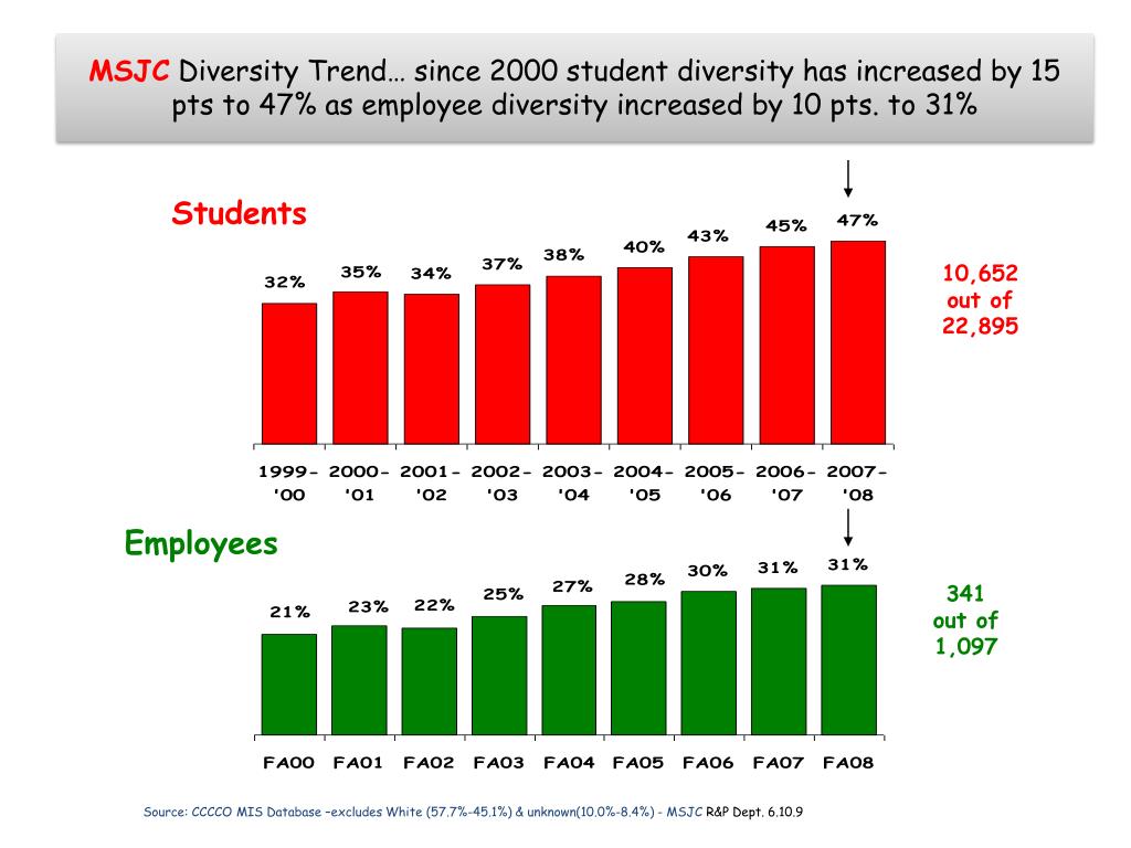 MSJC Diversity Trend… since 2000 student diversity has increased by 15 pts to 47% as employee diversity increased by 10 pts. to 31% Students 10,652 out of 22,895 Employees 341 out of 1,097 Source: CCCCO MIS Database –excludes White (57.7%-45.1%) & unknown(10.0%-8.4%) - MSJC R&P Dept. 6.10.9