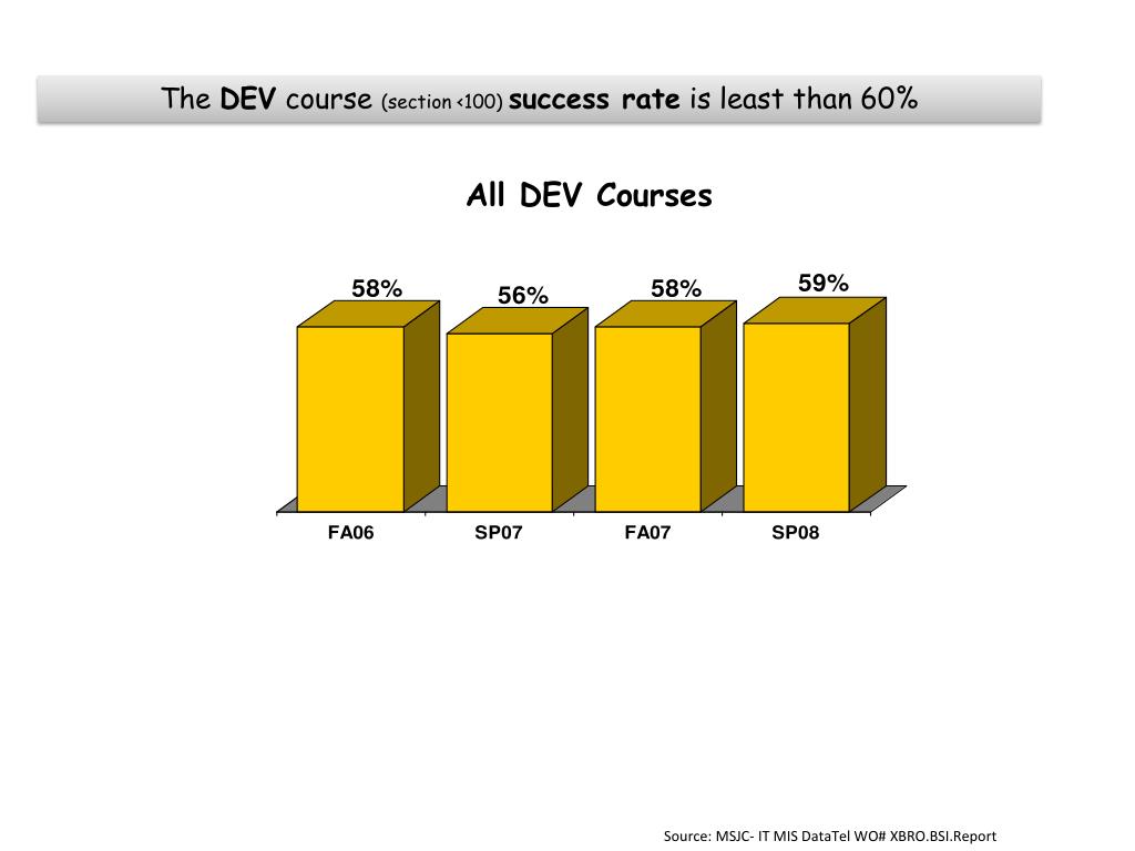 The DEV course (section <100) success rateis least than 60% All DEV Courses Source: MSJC- IT MIS DataTel WO# XBRO.BSI.Report
