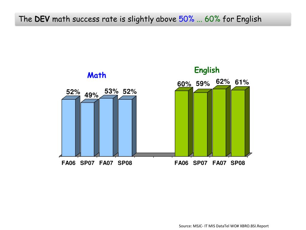 The DEV math success rate is slightly above 50%... 60%for English English Math Source: MSJC- IT MIS DataTel WO# XBRO.BSI.Report