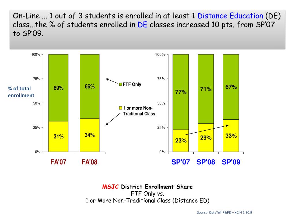 On-Line ... 1 out of 3 students is enrolled in at least 1 Distance Education (DE) class...the % of students enrolled in DE classes increased 10 pts. from SP’07 to SP’09. % of total enrollment MSJCDistrict Enrollment Share FTF Only vs. 1 or More Non-Traditional Class (Distance ED) Source: DataTel :R&PD – XCJH 1.30.9