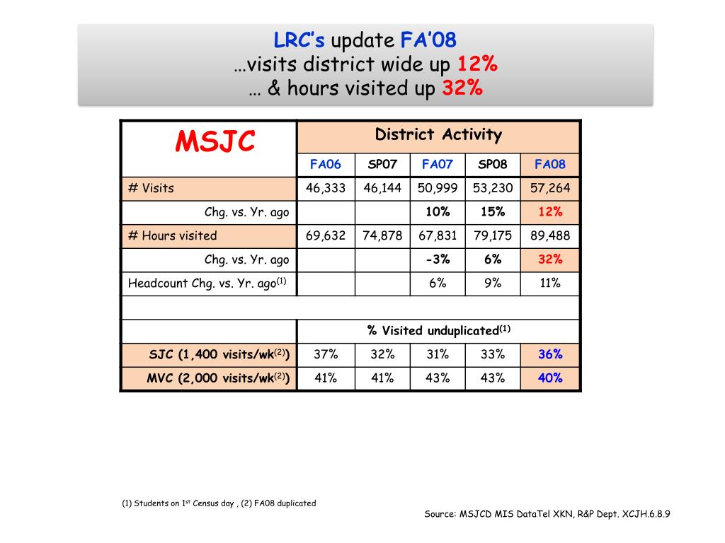 LRC’s update FA’08 …visits district wide up 12% … & hours visited up 32% (1) Students on 1st Census day , (2) FA08 duplicated Source: MSJCD MIS DataTel XKN, R&P Dept. XCJH.6.8.9