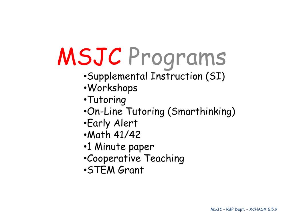 MSJC Programs Supplemental Instruction (SI) Workshops Tutoring On-Line Tutoring (Smarthinking) Early Alert Math 41/42 1 Minute paper Cooperative Teaching STEM Grant MSJC – R&P Dept. – XCHASX 6.5.9