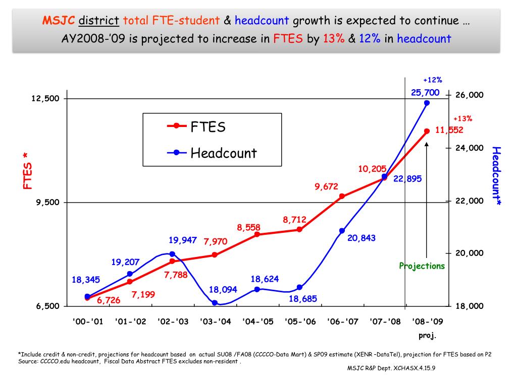MSJCdistricttotal FTE-student & headcountgrowth is expected to continue … AY2008-’09 is projected to increase in FTESby 13% &12% in headcount +12% +13% Projections *Include credit & non-credit, projections for headcount based on actual SU08 /FA08 (CCCCO-Data Mart) & SP09 estimate (XENR –DataTel), projection for FTES based on P2 Source: CCCCO.edu headcount, Fiscal Data Abstract FTES excludes non-resident . MSJC R&P Dept. XCHASX.4.15.9