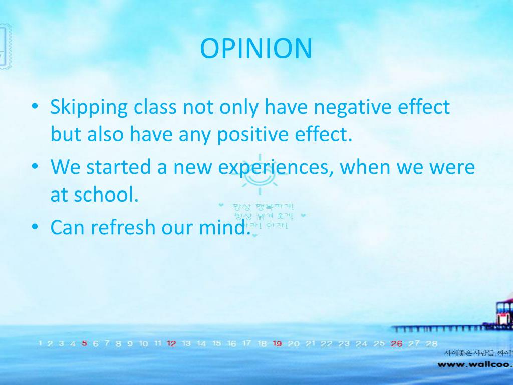OPINION • Skipping class not only have negative effect but also have any positive effect. • We started a new experiences, when we were at school. • Can refresh our mind.