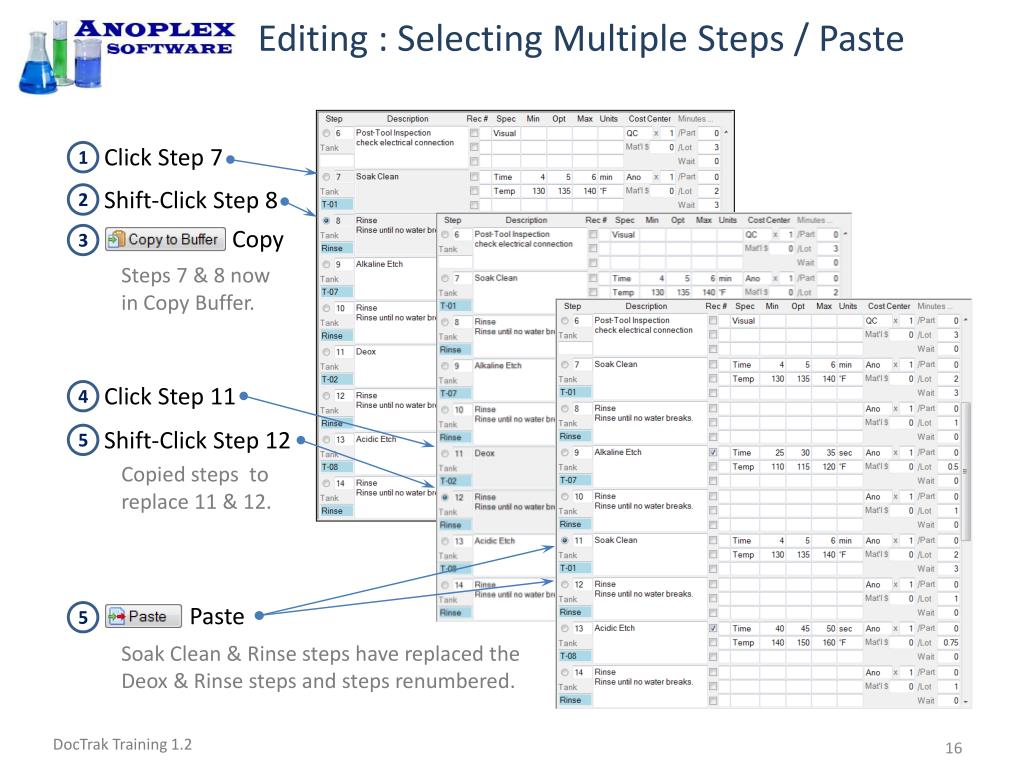 Editing : Selecting Multiple Steps / Paste Click Step 7 Shift-Click Step 8 Copy Steps 7 & 8 now in Copy Buffer. 3 1 2 4 5 5 Click Step 11 Shift-Click Step 12 Copied steps to replace 11 & 12. Paste Soak Clean & Rinse steps have replaced the Deox & Rinse steps and steps renumbered.