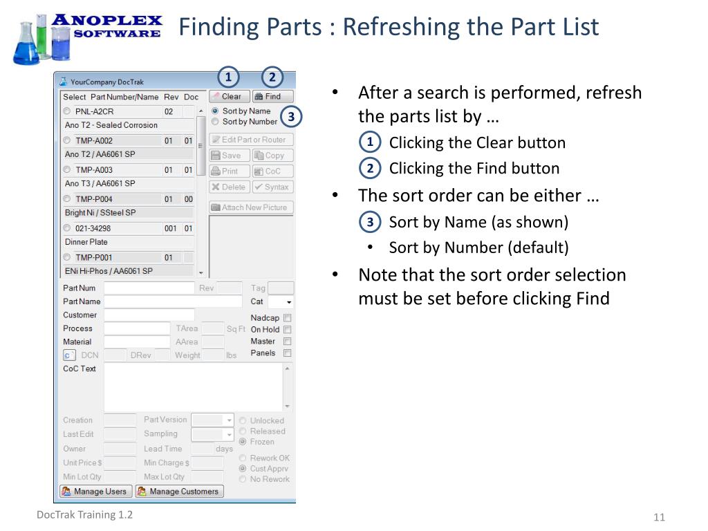 Finding Parts : Refreshing the Part List 2 1 • After a search is performed, refresh the parts list by … • Clicking the Clear button • Clicking the Find button • The sort order can be either … • Sort by Name (as shown) • Sort by Number (default) • Note that the sort order selection must be set before clicking Find 3 1 3 2