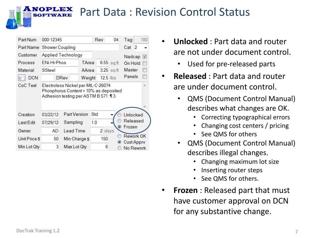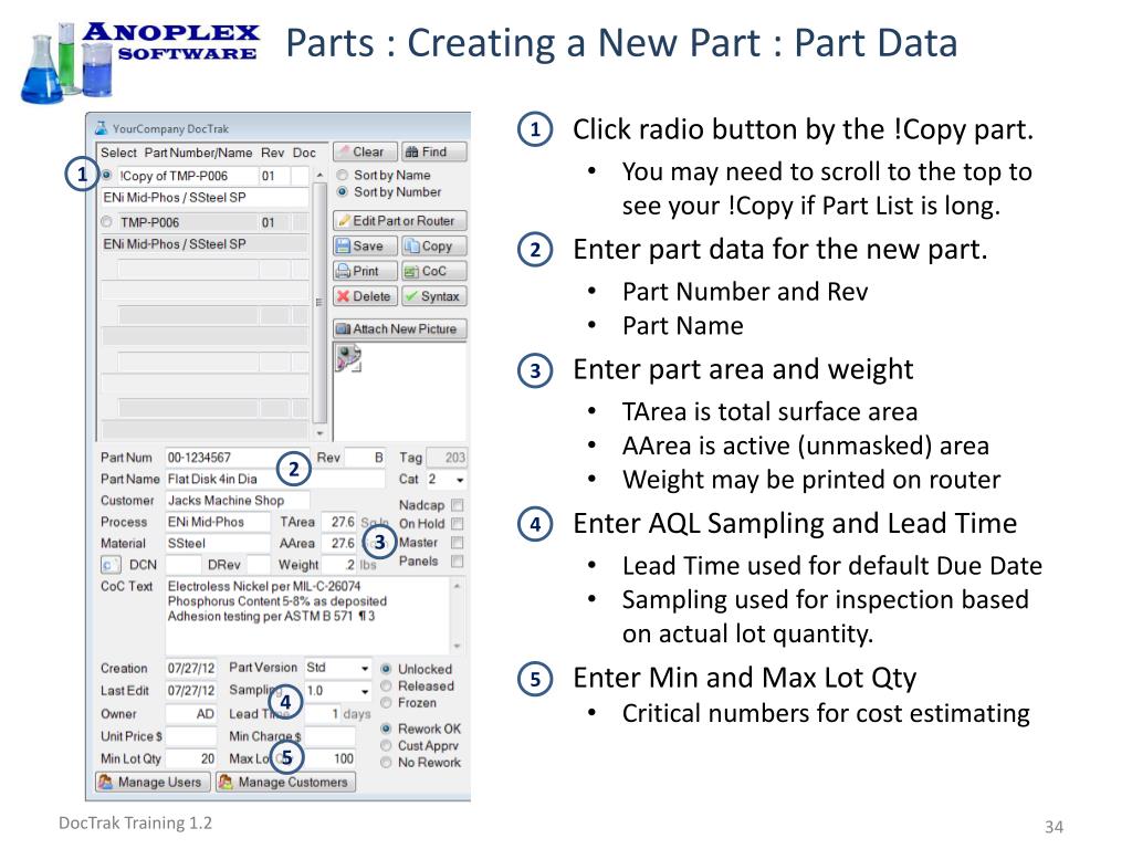 DocTrak Training • Screen Overview Pg 2 • New Customers • Part Data • Part Checkboxes • Release Status • Rework Status • Commands • Finding Parts Pg 10 • Searchable Fields • Filtering the Part List • Refreshing the Part List • Editing Parts Pg 12 • Selecting a Part • Doc Control Warnings • Editing Commands • Using Pick Lists • Estimating Cost Pg 21 • Cost Centers • Calculating Cost/Time • Working with Masters Pg 23 • Master Overview • Finding and Naming Masters • Creating a New Master • Part Data Entry • Part Versions • Nadcap Conformant Routers • Issues per AC 7108 Rev E • Checking the Router • Working with Parts Pg 32 • Finding Masters • Copying Masters • Entering Part Data • Editing the Router • Checking Syntax • Acceptance Tests • CoC & Inspection Reports • Attaching a Picture • DCN System Pg 43