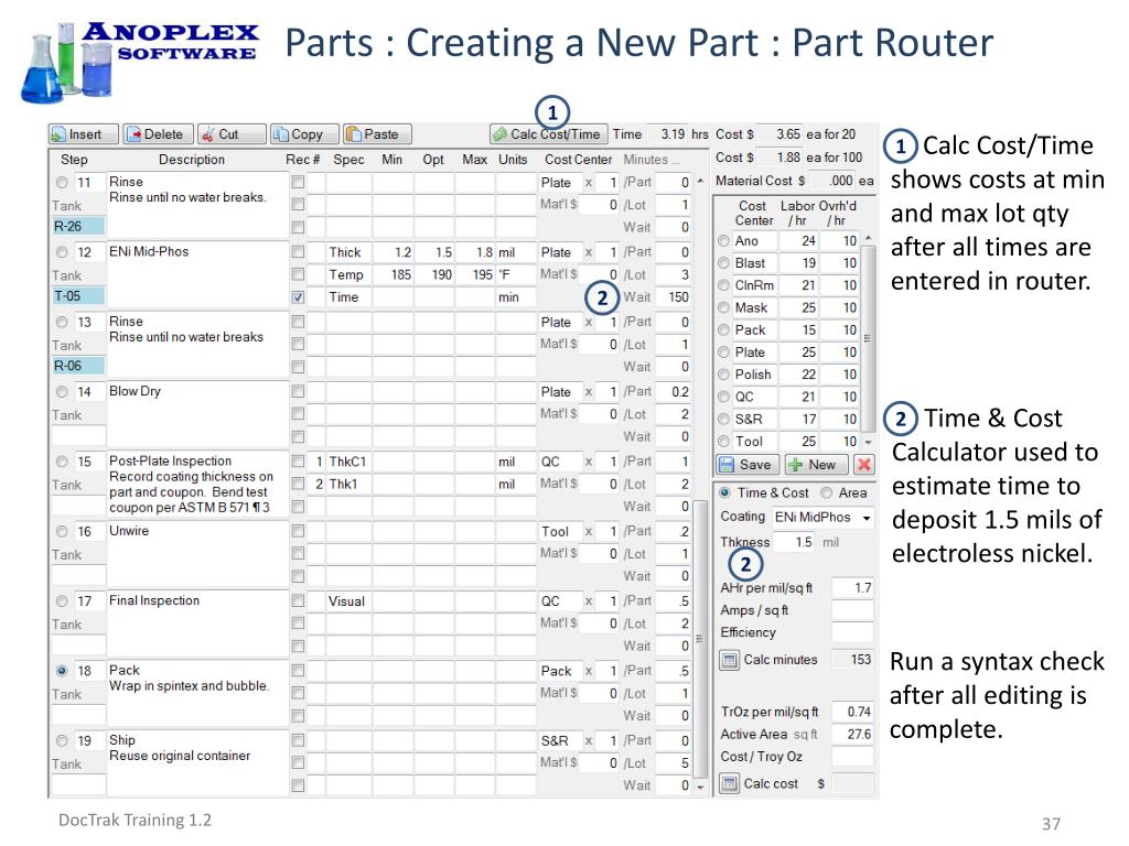 Parts : Creating a New Part : Part Router Calc Cost/Time shows costs at min and max lot qty after all times are entered in router. 1 2 2 1 2 Time & Cost Calculator used to estimate time to deposit 1.5 mils of electroless nickel. Run a syntax check after all editing is complete.