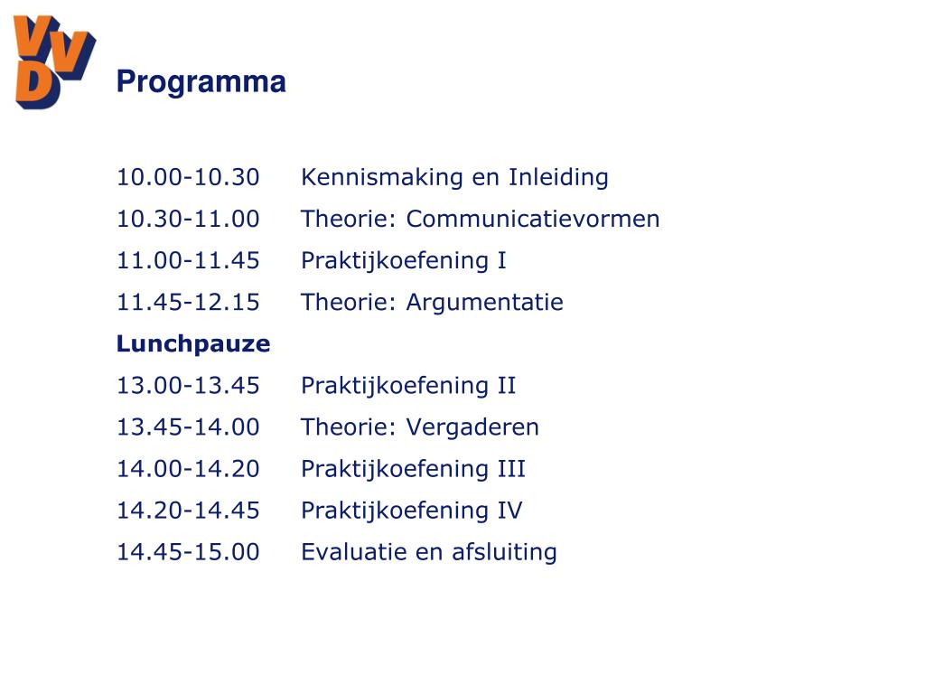 Programma • 10.00-10.30Kennismaking en Inleiding • 10.30-11.00Theorie: Communicatievormen • 11.00-11.45Praktijkoefening I • 11.45-12.15Theorie: Argumentatie • Lunchpauze • 13.00-13.45Praktijkoefening II • 13.45-14.00 Theorie: Vergaderen • 14.00-14.20 Praktijkoefening III • 14.20-14.45 Praktijkoefening IV • 14.45-15.00Evaluatieen afsluiting • s