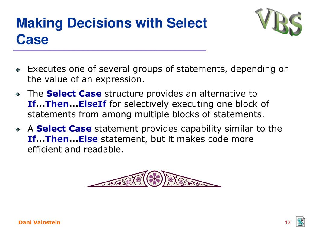 Making Decisions with Select Case • SelectCase strCreditCard Case "MasterCard" DisplayMCLogo ValidateMCAccount Case "Visa" DisplayVisaLogo ValidateVisaAccount Case "American Express" DisplayAMEXCOLogo ValidateAMEXCOAccount CaseElse DisplayUnknownImage PromptAgain EndSelect
