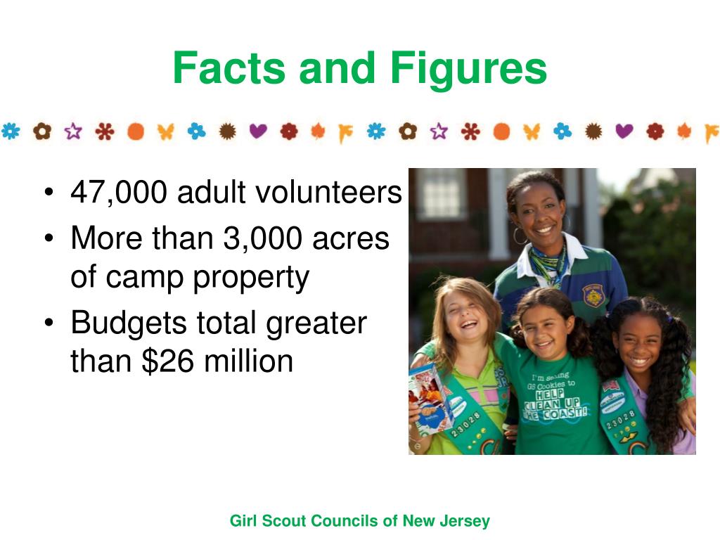 Girl Scouts of New Jersey July 10, 2013. Facts and Figures. 98,000 Girl Scouts in New Jersey Girls Kindergarten through 12 th grade Girl Scouts in every municipality in NJ. Facts and Figures. 47,000 adult volunteers More than 3,000 acres of camp property