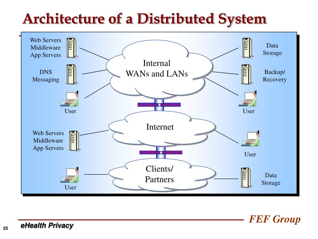 Architecture of a Distributed System Web Servers Middleware App Servers Data Storage Internal WANs and LANs DNS Messaging Backup/ Recovery User User Internet Web Servers Middleware App Servers User Clients/ Partners Data Storage User