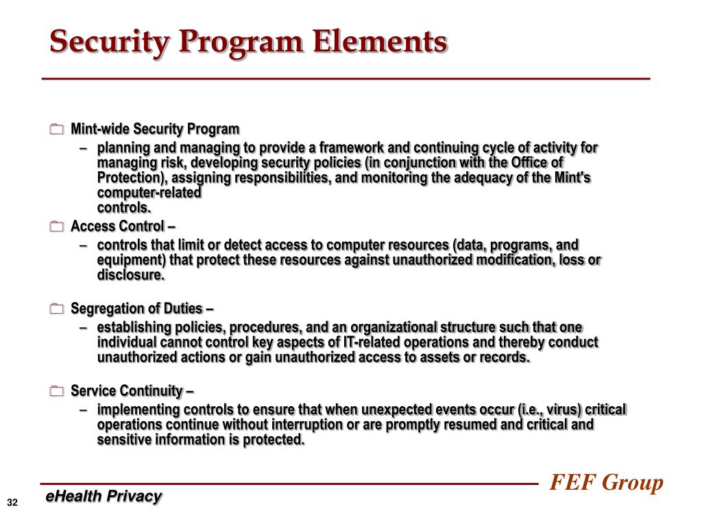 Security Program Elements • Mint-wide Security Program • planning and managing to provide a framework and continuing cycle of activity for managing risk, developing security policies (in conjunction with the Office of Protection), assigning responsibilities, and monitoring the adequacy of the Mint's computer-relatedcontrols. • Access Control – • controls that limit or detect access to computer resources (data, programs, and equipment) that protect these resources against unauthorized modification, loss or disclosure. • Segregation of Duties – • establishing policies, procedures, and an organizational structure such that one individual cannot control key aspects of IT-related operations and thereby conduct unauthorized actions or gain unauthorized access to assets or records. • Service Continuity – • implementing controls to ensure that when unexpected events occur (i.e., virus) critical operations continue without interruption or are promptly resumed and critical and sensitive information is protected.