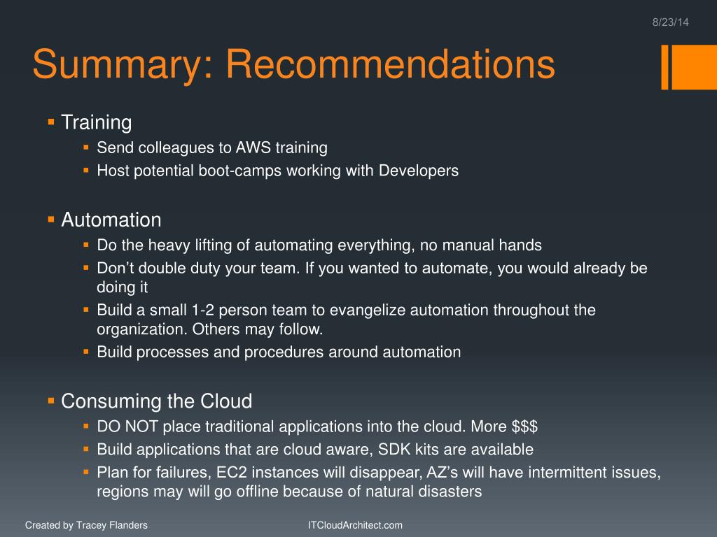 Summary: Recommendations • Training • Send colleagues to AWS training • Host potential boot-camps working with Developers • Automation • Do the heavy lifting of automating everything, no manual hands • Don’t double duty your team. If you wanted to automate, you would already be doing it • Build a small 1-2 person team to evangelize automation throughout the organization. Others may follow. • Build processes and procedures around automation • Consuming the Cloud • DO NOT place traditional applications into the cloud. More $$$ • Build applications that are cloud aware, SDK kits are available • Plan for failures, EC2 instances will disappear, AZ’s will haveintermittent issues, regions may will go offline because of natural disasters Created by Tracey Flanders