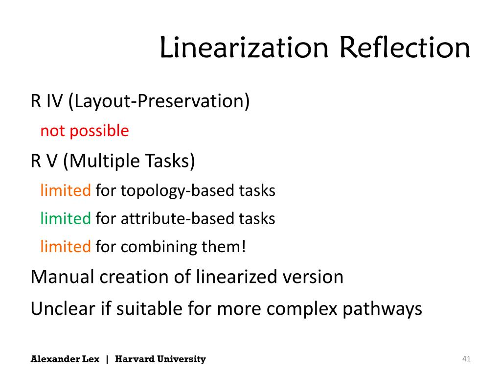 Linearization Reflection • R IV (Layout-Preservation) • not possible • R V (Multiple Tasks) • limitedfor topology-based tasks • limitedfor attribute-based tasks • limitedfor combining them! • Manual creation of linearized version • Unclear if suitable for more complex pathways Alexander Lex | Harvard University