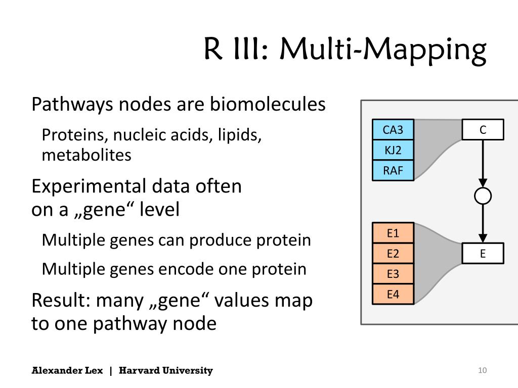 R III: Multi-Mapping • Pathways nodes are biomolecules • Proteins, nucleic acids, lipids, metabolites • Experimental data often on a „gene“ level • Multiple genes can produce protein • Multiple genes encode one protein • Result: many „gene“ values map to one pathway node CA3 C KJ2 RAF E1 E2 E E3 E4 Alexander Lex | Harvard University