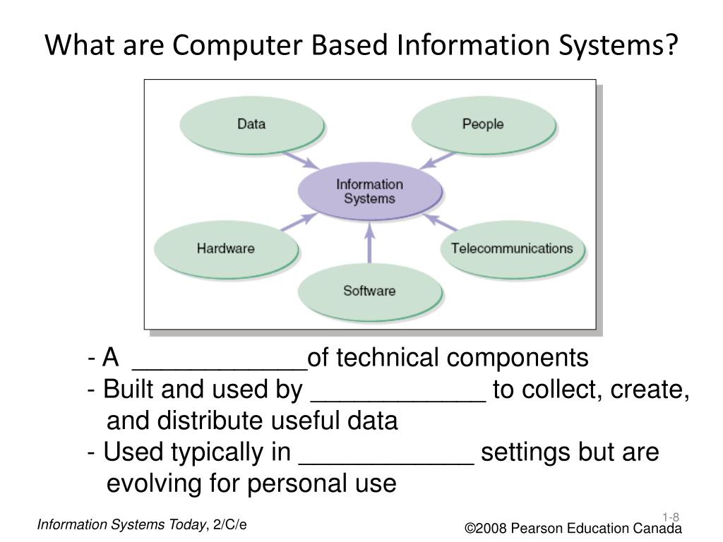 What are Computer Based Information Systems? - A ____________of technical components - Built and used by ____________ to collect, create, and distribute useful data - Used typically in ____________ settings but are evolving for personal use