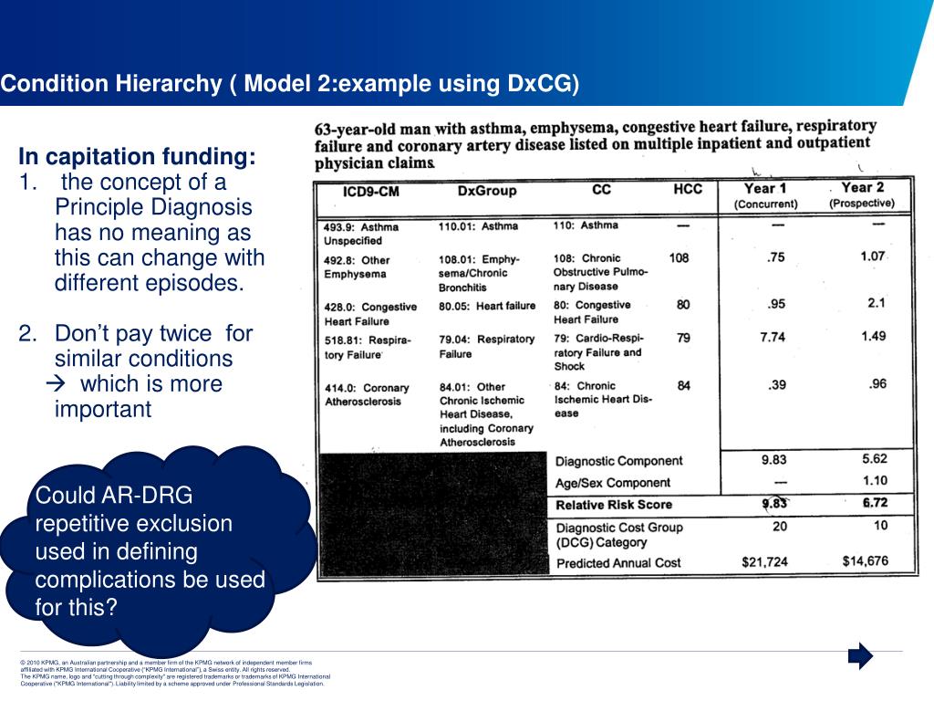 Condition Hierarchy ( Model 2:example using DxCG) In capitation funding: • the concept of a Principle Diagnosis has no meaning as this can change with different episodes. • Don’t pay twice for similar conditions which is more important Could AR-DRG repetitive exclusion used in defining complications be used for this?