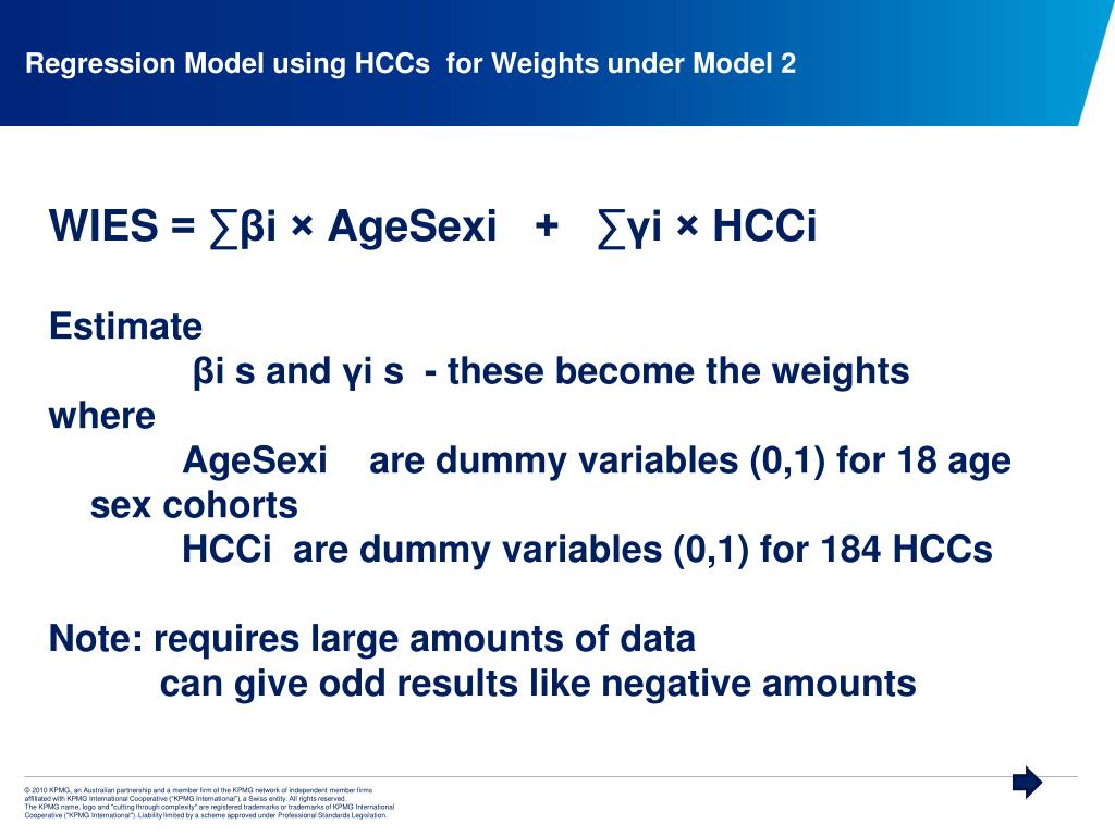 Regression Model using HCCs for Weights under Model 2 WIES = ∑βi × AgeSexi + ∑γi × HCCi Estimate βi s and γi s - these become the weights where AgeSexi are dummy variables (0,1) for 18 age sex cohorts HCCi are dummy variables (0,1) for 184 HCCs Note: requires large amounts of data can give odd results like negative amounts