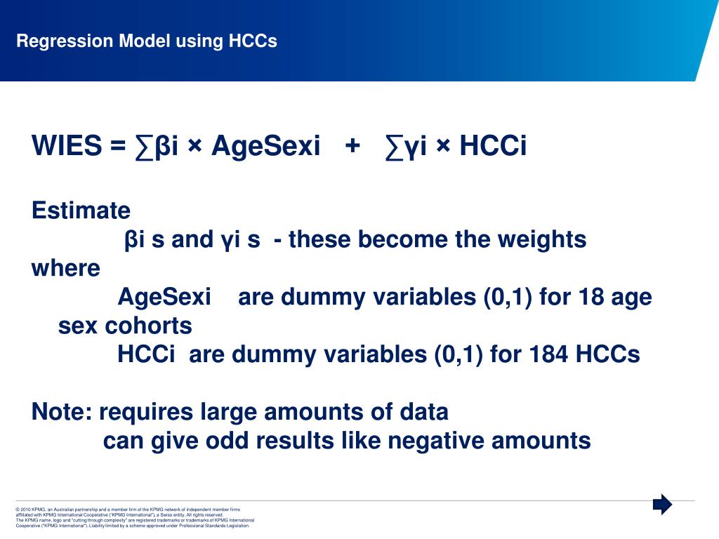 Regression Model using HCCs WIES = ∑βi × AgeSexi + ∑γi × HCCi Estimate βi s and γi s - these become the weights where AgeSexi are dummy variables (0,1) for 18 age sex cohorts HCCi are dummy variables (0,1) for 184 HCCs Note: requires large amounts of data can give odd results like negative amounts