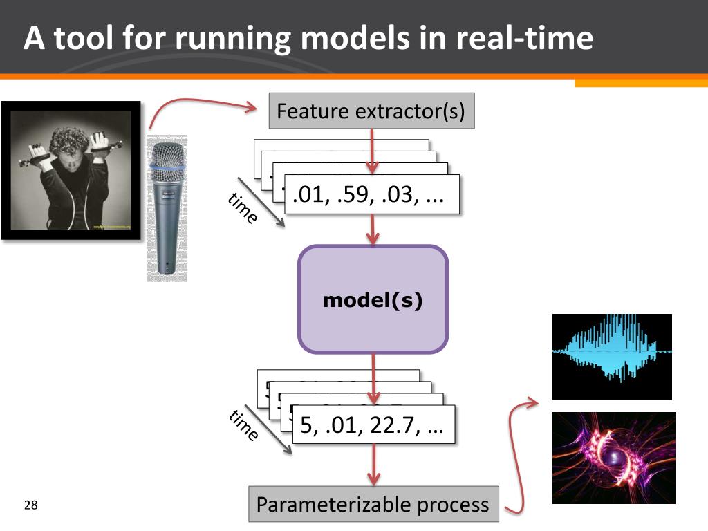 A tool for running models in real-time Feature extractor(s) .01, .59, .03, ... .01, .59, .03, ... .01, .59, .03, ... .01, .59, .03, ... time model(s) 5, .01, 22.7, … 5, .01, 22.7, … 5, .01, 22.7, … 5, .01, 22.7, … time Parameterizable process