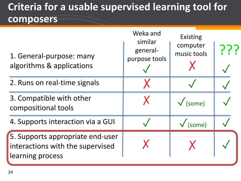 Criteria for a usable supervised learning tool for composers Weka and similar general-purpose tools Existing computer music tools ??? 1. General-purpose: many algorithms & applications ✗ ✓ ✓ ✗ ✓ ✓ 2. Runs on real-time signals ✗ ✓(some) ✓ 3. Compatible with other compositional tools ✓ ✓(some) ✓ 4. Supports interaction via a GUI 5. Supports appropriate end-user interactions with the supervised learning process ✗ ✗ ✓