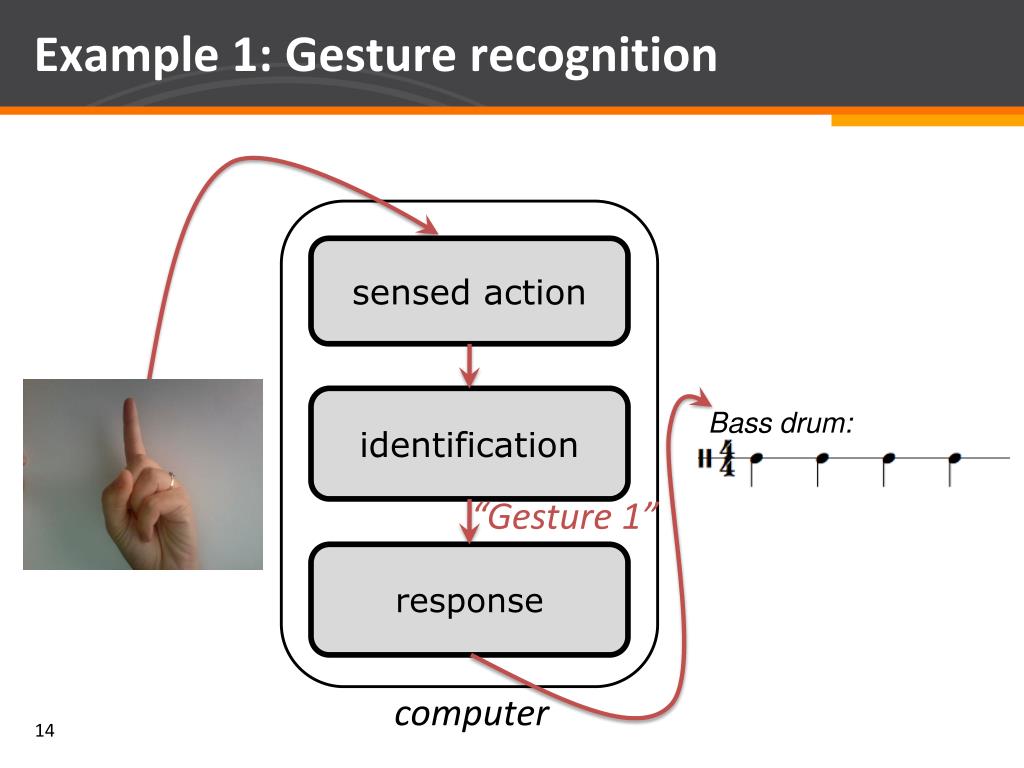 Example 1: Gesture recognition sensed action identification Bass drum: “Gesture 1” response computer