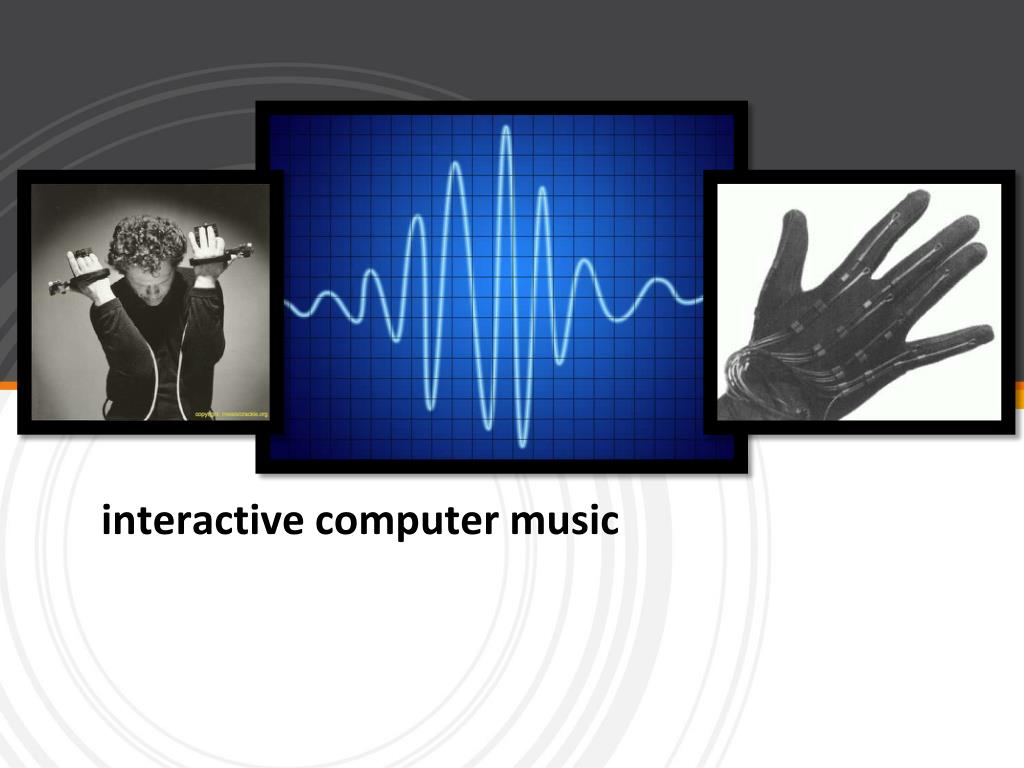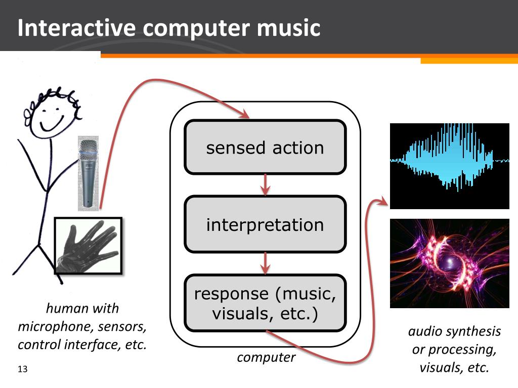 Interactive computer music sensed action interpretation response (music, visuals, etc.) human with microphone, sensors, control interface, etc. audio synthesis or processing, visuals, etc. computer