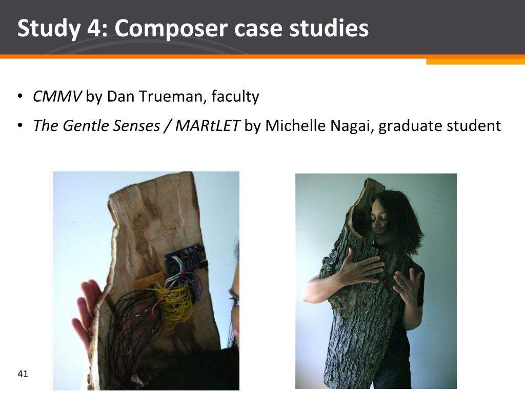 Study 4: Composer case studies • CMMV by Dan Trueman, faculty • The Gentle Senses / MARtLET by Michelle Nagai, graduate student
