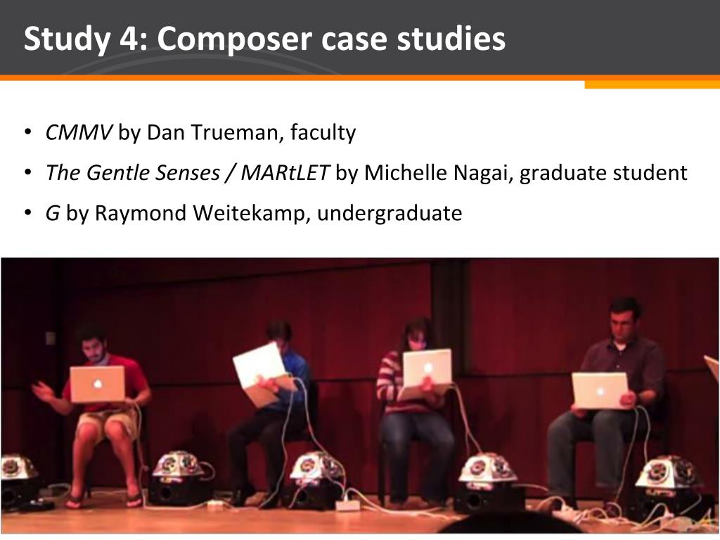 Study 4: Composer case studies • CMMV by Dan Trueman, faculty • The Gentle Senses / MARtLET by Michelle Nagai, graduate student • G by Raymond Weitekamp, undergraduate