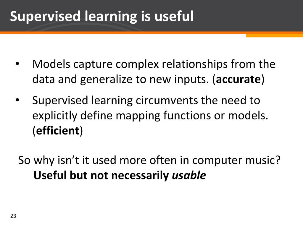 Supervised learning is useful • Models capture complex relationships from the data and generalize to new inputs. (accurate) • Supervised learning circumvents the need to explicitly define mapping functions or models. (efficient) So why isn’t it used more often in computer music? Useful but not necessarily usable